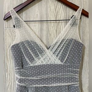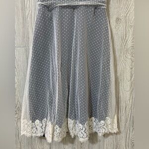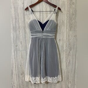 A great summer dress would make a great party, shower, or cocktail dress. Navy blue underdress with a sweetheart neckline, polka dot tulle overlay creating a double v neckline. Lace detail at the hemline. Zipper back no rips or tears in great condition. Polyester and acetate. Size 10