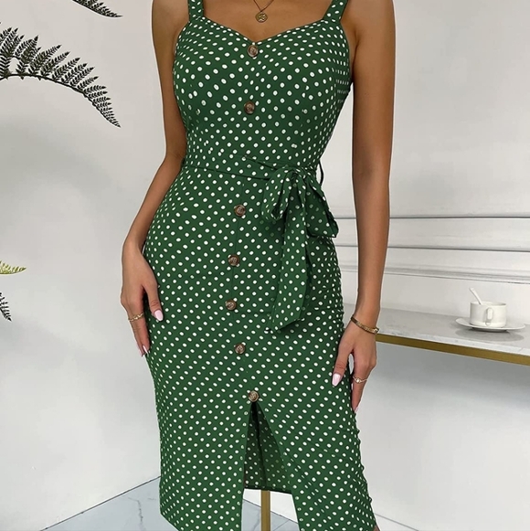 Features: polka dots, button front, split hem, belted, v neck, casual, wrap, spring summer, sweet and cute