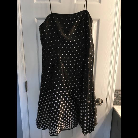 This is a fun and flirty black and white polka dot dress. It has a petty coat lining underneath for extra flare and spaghetti straps. Size 16.
