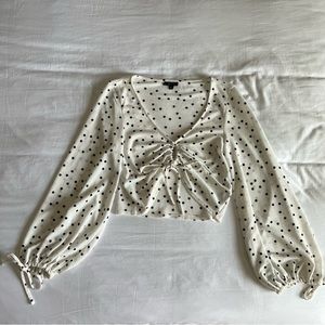 Topshop polka dot blouse. Full sleeve with elastic and tie. V-neck with tie & loop. Black and cream. Size 6