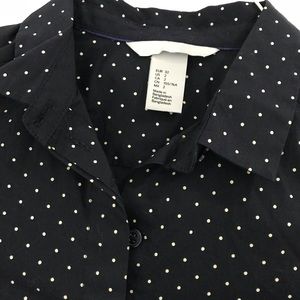 Super cute polka dot shirt! Very flattering and surprisingly stretchy fabric. Slim fit is easy to tuck into pants. The buttons are hidden under the extra top piece of fabric.