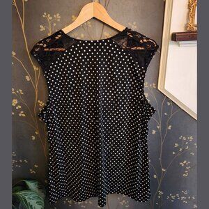 Cowl neck, short-sleeved shirt by Torrid, size 3. This plus-size blouse is lightly worn and in great condition. Flowy material in a timeless black and white, polka dot pattern. A deep cowl neck is complemented by delicate lace cap sleeves.