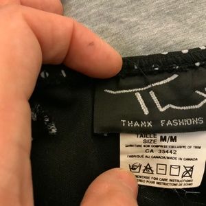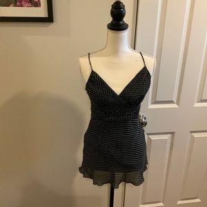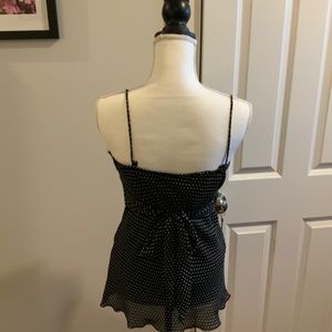 Black and white, size medium. Spaghetti straps. Ties around the middle so it’s very flattering. I did have the straps taken up a bit so it was less low-cut.