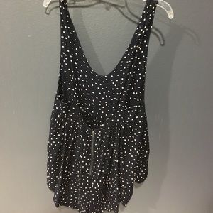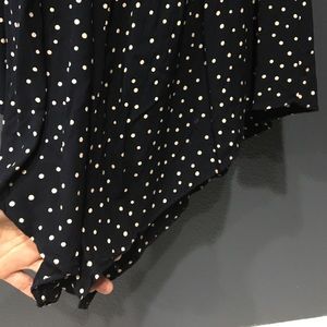 Loose-fitting polka dot romper with wide opening leg holes (see pic for reference).