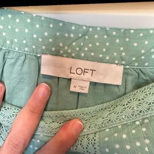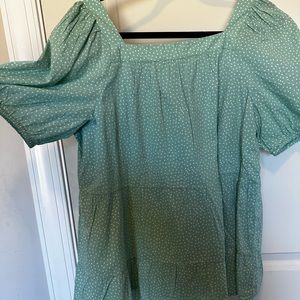 Green with white polka dots. Beautiful lace trim, puffed sleeves and square neckline.