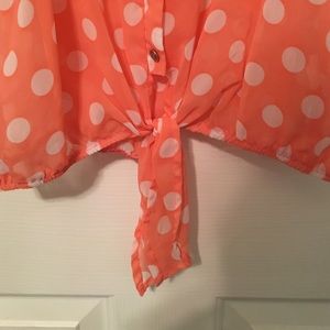 Salmon tank with white polka dots. Faux silver buttons. Ties at the bottom.