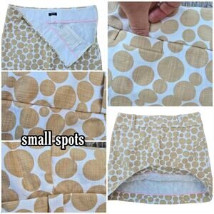 Tan polka dots on white background. Non stretch fabric: fabric content label missing, but likely cotton fabric. Has a linen look. Side zip, unlined, 2 tiny pockets in front. Issues noted in photos. Very good preowned condition, overall.