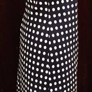 Navy with white polka-dots/floor length/Sz. XS/Very flattering dress!