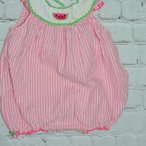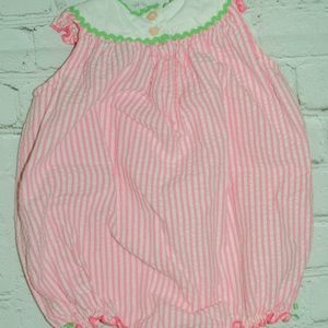 This adorable little girls romper is sized at 9 months. It's a PolkaTots name brand. The romper is in great shape, all buttons are attached and secure, with no stains.