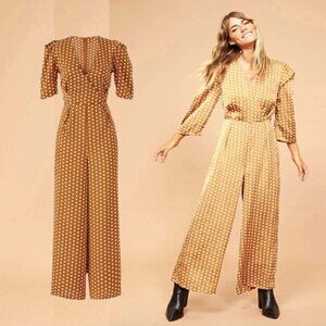 MINKPINK polkadot jumpsuit. Goldenrod/ mustard. Satin sheen. Flare pant and wrap around waist.
