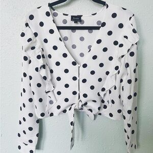Polkadot blouse by Blouse with ruffles, V-neck, button front, front waist tie. Super girly perfect for a date. Nice quality material. 74% Viscose, 21% Lyocell, 5% Linen. No stains or tears, see measurements below.