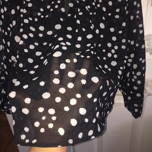 Very sheer , has white polkadots , the arms are slot open both top and bottom , it's crop , it's a very chickyyy top if work right :) never worn