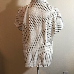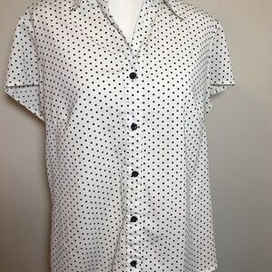 Size large pit to put measurements are 21 inches. No flaws. V neck style. Polka dot all over