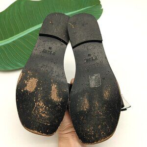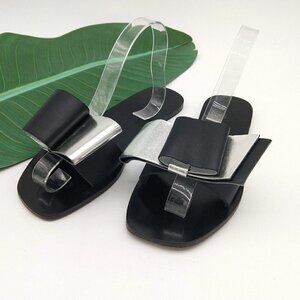 Pollini Italy black and metallic silver bow accented slip on open toe sandals, size 38. They are gently pre-owned and free from any stains or flaws. Show light wear or scuffs from normal use.