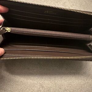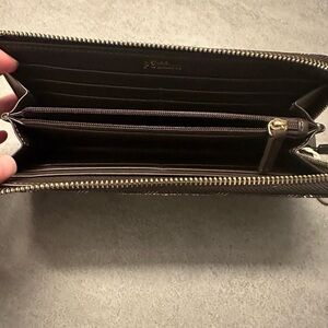 Two compartments. One zip compartment. Twelve credit card slots. Zipper closure . Artificial