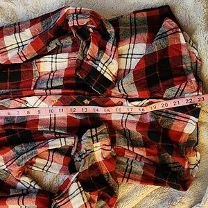 Pre-loved. Red, black, and white plaid flannel button-down top. Roll cuff sleeves to roll up or down. 1 pocket on front. All measurements are in photos.