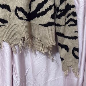 Embrace bold style with the Polly & Esther V-Neck Sweater, showcasing a striking animal print in black stripes on a light beige background. This medium-weight knit features a relaxed silhouette and a trendy distressed hem for a modern, casual look.