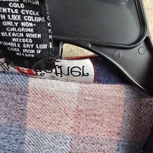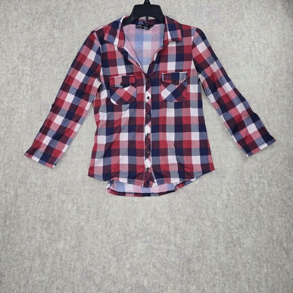 Polly & Esther Womens Red & Navy Plaid Button-Up Shirt Long Sleeve