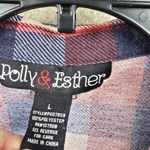 This Polly & Esther women's long-sleeve plaid shirt in red and navy combines lightweight comfort with casual style. Made from 100% polyester, it features functional front pockets, roll-tab sleeves, and a button-up closure. Perfect for layering or wearing on its own. Made in China, it's machine washable for easy care.