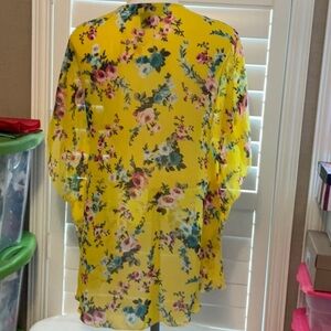 Vibrant yellow cardigan with floral design. Sheer and lightweight. Ideal for layering.
