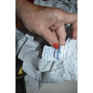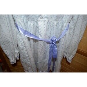 Vintage dress in beautiful condition. The cotton dress is precious. Timeless style, back button, bow, collar and puff sleeves. Full skirt. Polly Flinders made this pretty dress. Lavendar ribbon woven through with white lace.