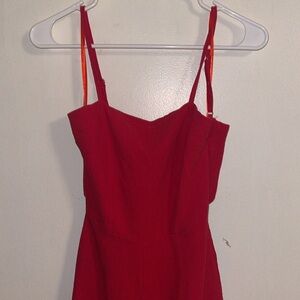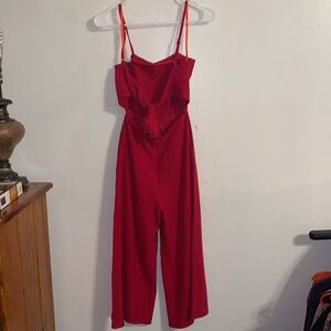 Stylish red jumpsuit with spaghetti straps. Perfect for any occasion. Comfortable and trendy.