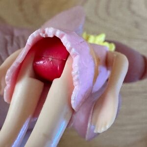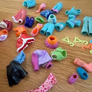 Polly Pocket 2003 Carrying Case and Dolls and Accessories. A nice Polly Pocket collection from 2002-2003. Includes 6 girl dolls and one boy doll. One of the girls is broken (see last picture.) The dolls are poseable. There is a bed, dog, hats, hangars and a lot of silicone outfits. The boy is wearing a pair of shoes. There are 3 odd shoes, but no complete pairs of shoes. The bottom of the bed (pic 11) is dated 2002. The inside of the case is dated 2003. The dual zipper case is in excellent, clean condition with no stains, tears or holes. Case measures: 9"HX 9 1/4" W and 4" deep; handle drop: 3".