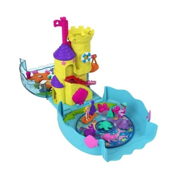 Time for a splashy bubble-filled adventure with Polly Pocket! Perfect for play at home or on the go, the Bubble Aquarium features an adorable see-through aquarium shape and is filled with activities and accessories for underwater fun! Open to reveal 360 degrees of play with 10 features, micro Polly and mermaid dolls, bubble solution and 18 accessories! Kids can pump the castle flag to activate bubbles and the playset folds out for 360 degrees of play. Kids can also pour the bubble solution into the pool and use the turtle bubble blower to make bubbles! There's also a slide, a seahorse see-saw, seashell swing, a starfish that spins and a whirlpoolturn the turtle to activate. Kids can also open the treasure chest and clamshell to peek inside! Some of the accessories have a Pop & Swap feature that lets kids peg the pieces into different areas of the Bubble Aquarium for endless play possibilities! Colors and decorations may vary. Makes a great gift for ages 4 years old and