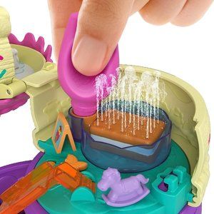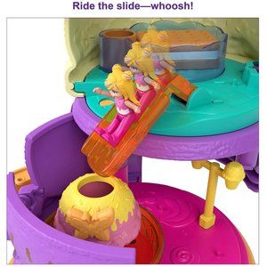 Get ready for Theme Park Adventures with Polly Pocket! The super-sweet Spin 'n Surprise Playground is shaped like an ice cream cone and has a lid that opens and 3 levels that spin out to reveal 3 floors of fun.