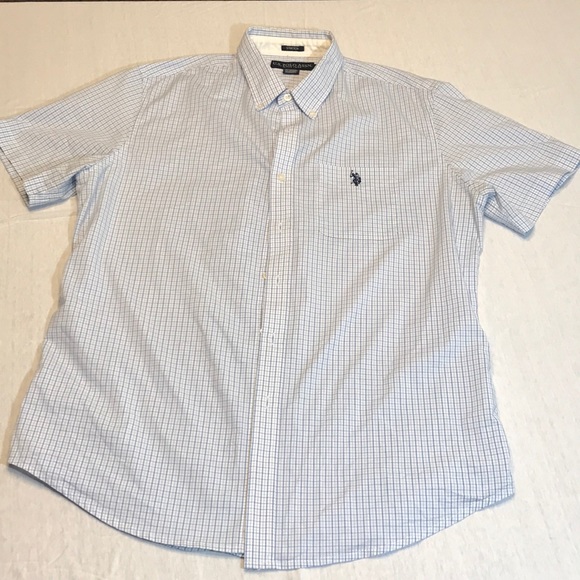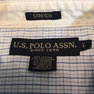 I have a large Polo Assassin casual shirt. It is white with blue stripes. It is a light shirt so it’s great for outdoor events. All around an excellent shirt.
