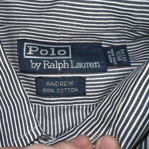 Introducing the Polo By Ralph Lauren Andrew Striped Long Sleeve Dress Shirt in size 15.5 32/33. This stylish shirt features a timeless striped pattern in blue color and is made of 100% cotton material. It is a dress shirt suitable for men and comes with a button closure.