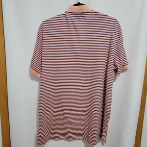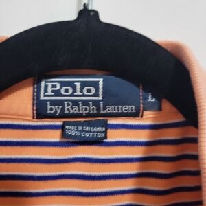 Classic Ralph Lauren polo with peach and navy stripes. Soft fabric for all-day comfort. Ideal for casual wear.