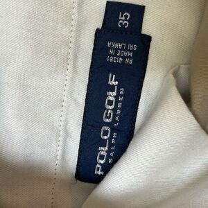 Timeless Polo Golf chino shorts, size 35. Features front slant pockets, back welt pockets, belt loops, and zip fly with button closure. Embroidered logo on back pocket. Made in Sri Lanka.