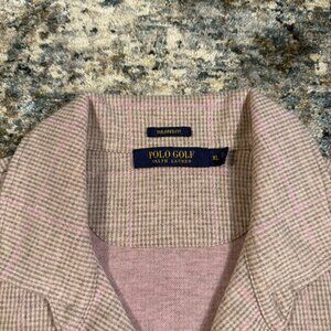 Pink + beige check Polo Golf Ralph Lauren top. Tailored fit, short sleeve, button front, super clean preppy look. RL sleeve tag.