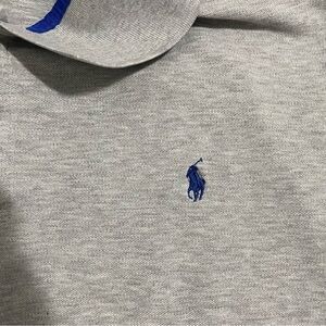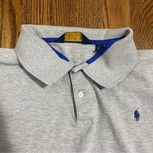 This is a men's Polo Golf Ralph Lauren polo shirt. It is gray with the traditional logo in blue. It is Pro Fit, made of 97% cotton and 3% elastane and is a size XXL.