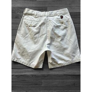 This product is a pair of men's Polo Golf Ralph Lauren pleated shorts in size 36. Made of twill fabric with a mid-rise waist and 8-inch inseam, they feature a classic chino style with belt loops and a zip closure. The shorts are white in color, with accents like buttons and a zipper, and they have slash pockets for convenience. Perfect for various occasions including casual, formal, and business settings, these shorts are easy to care for with machine washable instructions. In addition to being stylish and versatile, they are a symbol of American preppy fashion and a classic choice for any wardrobe.