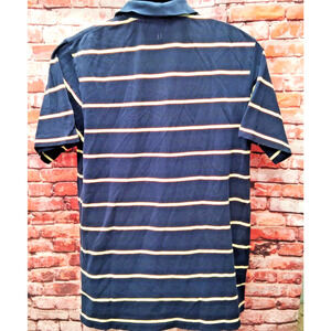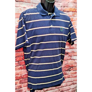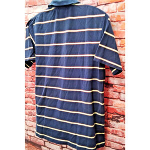 This Polo Golf Ralph Lauren Polo Shirt for men in size L is a navy striped performance short sleeve shirt. Made from 100% cotton knit fabric, it features a collared neckline, button closure, and a regular fit. Perfect for casual occasions during the summer season, this breathable shirt is ideal for outdoor activities like golfing. With its classic spread collar and iconic Ralph Lauren branding, this shirt offers both style and comfort for the modern man..