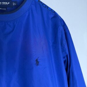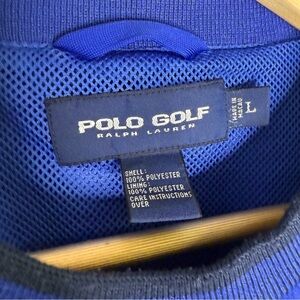 Keywords: Polo Golf jacket, Ralph Lauren rain jacket, blue pullover windbreaker, mesh-lined golf outerwear, water-resistant jacket, men’s size large, Polo quarter zip, athletic golf pullover, golf gear, Polo Golf rainwear.