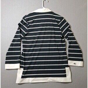 This Polo Golf Ralph Lauren Tunic Top for women in size medium features a stylish black and white striped pattern, collared neckline, and long sleeves with casual sleeves. Made from a polyester blend material with moisture-wicking properties, this pullover blouse is machine washable and suitable for various occasions like travel, casual wear, workwear, and business settings. The tunic top also includes the brand's logo as an accent, making it a versatile and fashionable addition to any wardrobe. Ideal for all seasons, this designer piece exudes a preppy and golf-inspired theme.