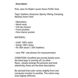Polo Jean Co Ralph Lauren Down Puffer Vest Size MP Black Outdoor Gorpcore