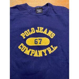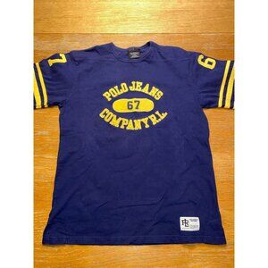Polo Jeans Co. tee with "67" print and yellow stripes on navy. Casual and sporty look.