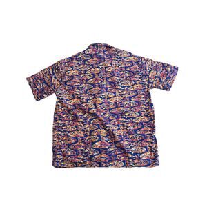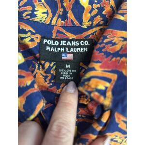 This Polo Jeans Co Ralph Lauren men's shirt features a unique fish all-over print on cotton fabric, perfect for a casual occasion or party. The shirt is a medium size with a regular fit, short sleeves, and a collared neckline with button closure. The vintage-inspired design includes a pocket and loop collar, reflecting the fish theme throughout the shirt. Made of blended fabric, this button-up shirt in multi-color is a stylish and comfortable addition to any man's wardrobe.