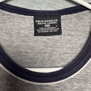 Keywords: Polo Jeans Co., T-shirt, Ringer Tee, Crew Neck, USA Flag, Embroidered Logo, Gray T-shirt, Vintage T-shirt, Casual Tee, Ralph Lauren, Polo RL Jeans