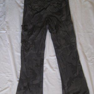 These pants are so cool! I just had to have them. Sadly, I never wore them, and now do not even fit into them. They are a dark grey camouflage print, and are 100% cotton. They are bootcut, and New With Tags, and just LOADED with POCKETS and ZIPPERS!!!!
