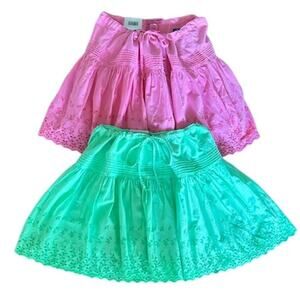 This set includes two beautifully embroidered cotton mini skirts in bright pink and mint green. Both are from the Polo Jeans Co. “Elaine Ballerina Mini” line and feature smocked waistbands, scalloped hems, and delicate eyelet details. Comfortable, feminine, and rare to find new!