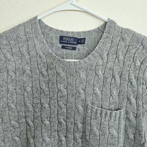 This 100% cashmere, gray, short sleeve, cable knit sweater for women by Polo Ralph Lauren is in great gently used condition! Size medium. Chest width is approx 17.5" wide. total length is approx. 24.5" long. It is supposed to be a more fitted style.