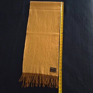 Polo Ralph Lauren 100% Lambswool Scarf Unisex. Tan on one side and cream on the other. Big Pony in contrast on each side. Made In Italy. Length is 52 inches plus 6 inches for fringe (measurement was taken with the scarf folded in half). Width is 11.5 inches. Although fabric tag says to dry clean, I handwashed it in Eucalan with Lavender and it came out beautiful. Very soft. Perfect for the colder weather. Excellent condition.