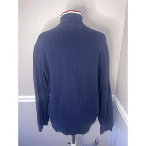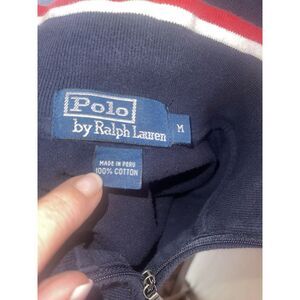 This Polo Ralph Lauren 1/4 pullover shirt is a must-have for any fashion-forward man. The navy, red, and white colors make for a stylish combination, while the cotton material ensures comfort all day long. The shirt features a mock neck and pockets for added convenience. Its size M is perfect for regular-sized men, and the pullover style is easy to wear. Ideal for casual occasions, this sweater is a great addition to any wardrobe. Approx measurements 23" across 28" long.