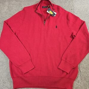 Mem's Polo Ralph Lauren 1/4 Zip Pullover Sweater, Red, Pima Cotton, size Large. See pictures for measurements. No blemishes, brand new with tags.