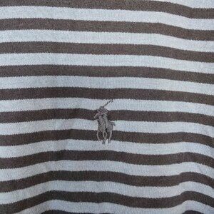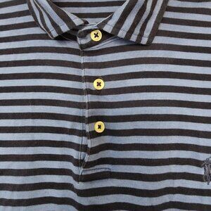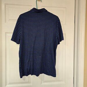Great condition men's Polo Ralph Lauren 2 button short sleeve polo shirt. Fabric is Pima Soft Touch cotton and colors are navy and medium blue stripes with navy logo. Size is XL.